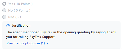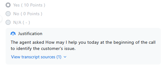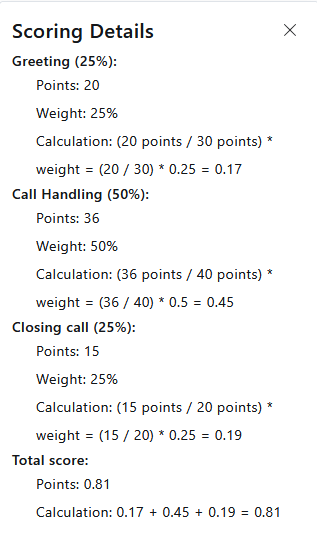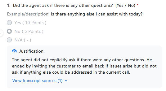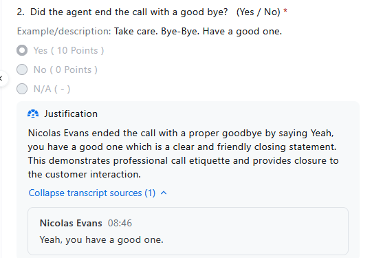 In this example, Nick's failure to mention his own name in the greeting, and lack of "Any other questions?" at closing prevented him from reaching the 85% goal.